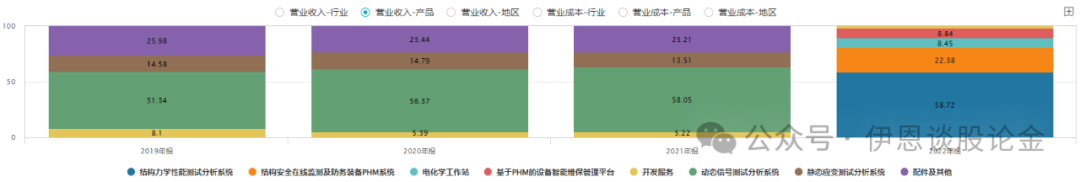 公司专注于智能化测控系统的研发和生产,是领先的结构力学性能研究整体解决方案供应商。公司拥有结构力学性能测试分析系统等四大类产品线,包含传感器、测控系统硬件和分析与控制软件平台, 所有产品都是自主研发、设计和生产,拥有独立自主的知识产权。公司产品广泛应用于国内航空航天、重大装备、大型建筑、轨道交通、新能源汽车、水利工程等行业。从产品结构上来看,2022年公司年报对产品重新进行了分类,其中:结构力学性能测试分析系统贡献大部分收入(58.72%)。