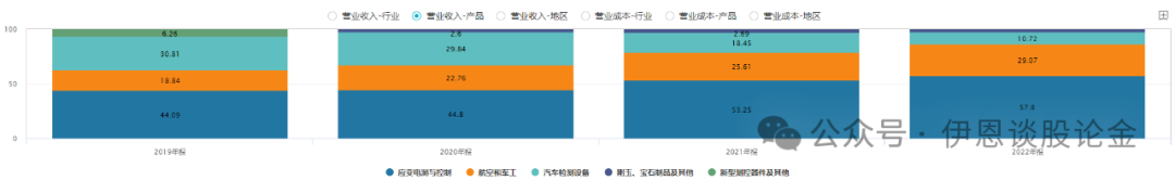 公司依托智能测控核心技术,发展为智能测控产品解决方案的一流供应商。业务涵盖航空军品、传感控制、智能交通、工业软件四大业务板块,是国内提供军民用智能测量和控制产品及系统解决方案的领先企业。从产品结构上来看,2022年贡献收入占比依次是应变电测与控制(57.8%,为主要贡献)、航空和竣工(29.07%)、汽车检测设备(10.72%)等。