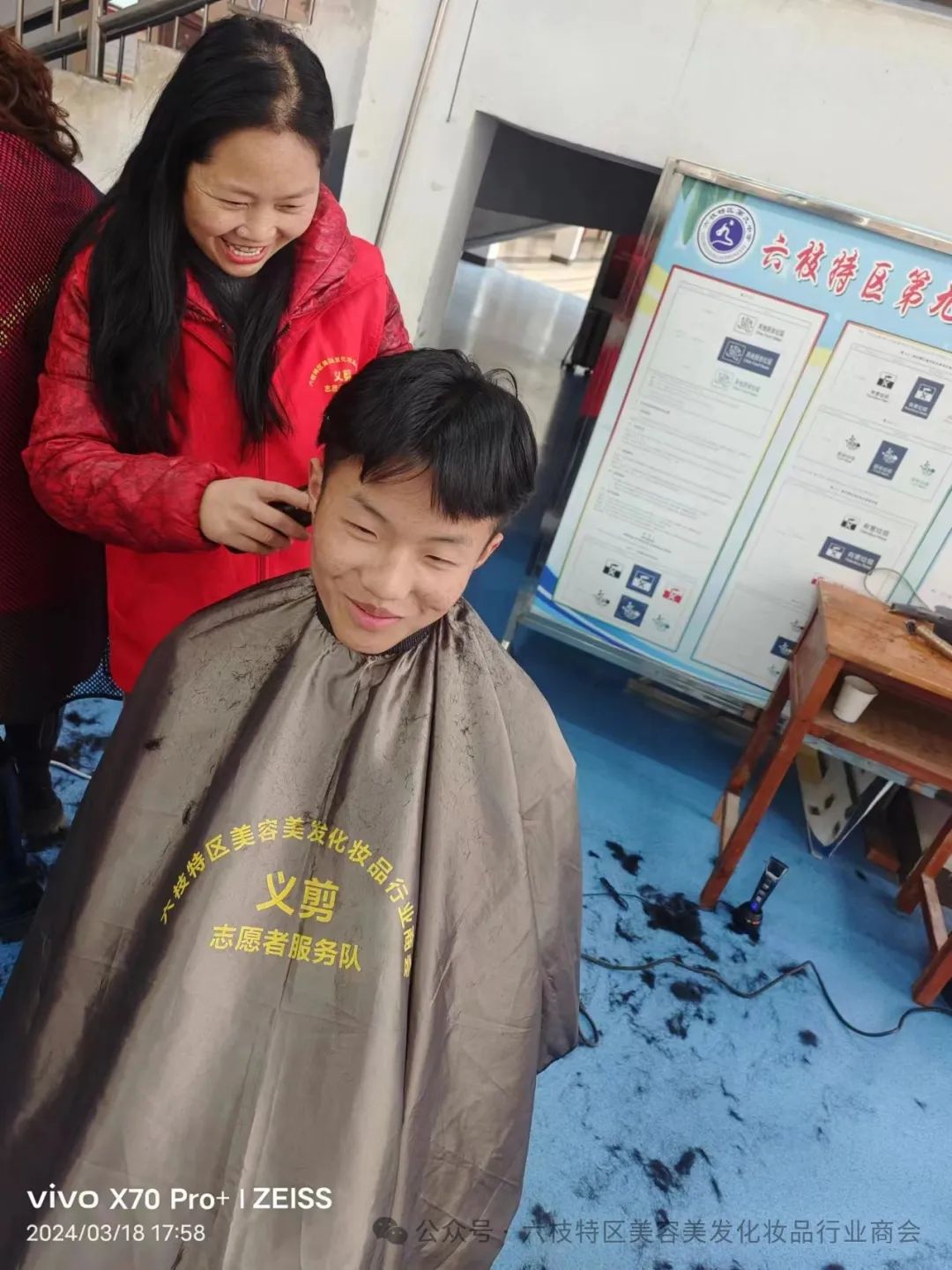 六枝特区美容美发化妆品行业商会副会长朱义琼,长期支持商会工作积极参加“义剪”志愿者服务.