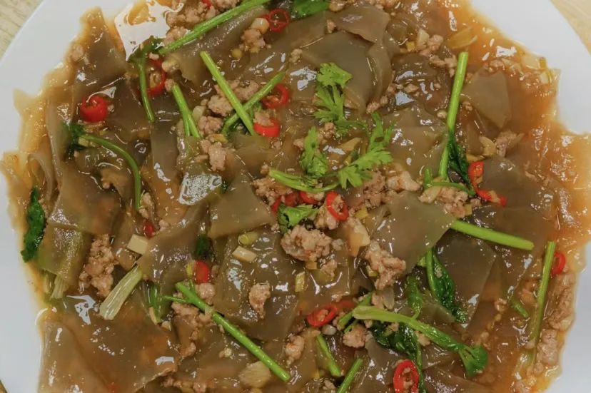 菜品:黄瓜芽炒粉条、芹菜炒培根肉