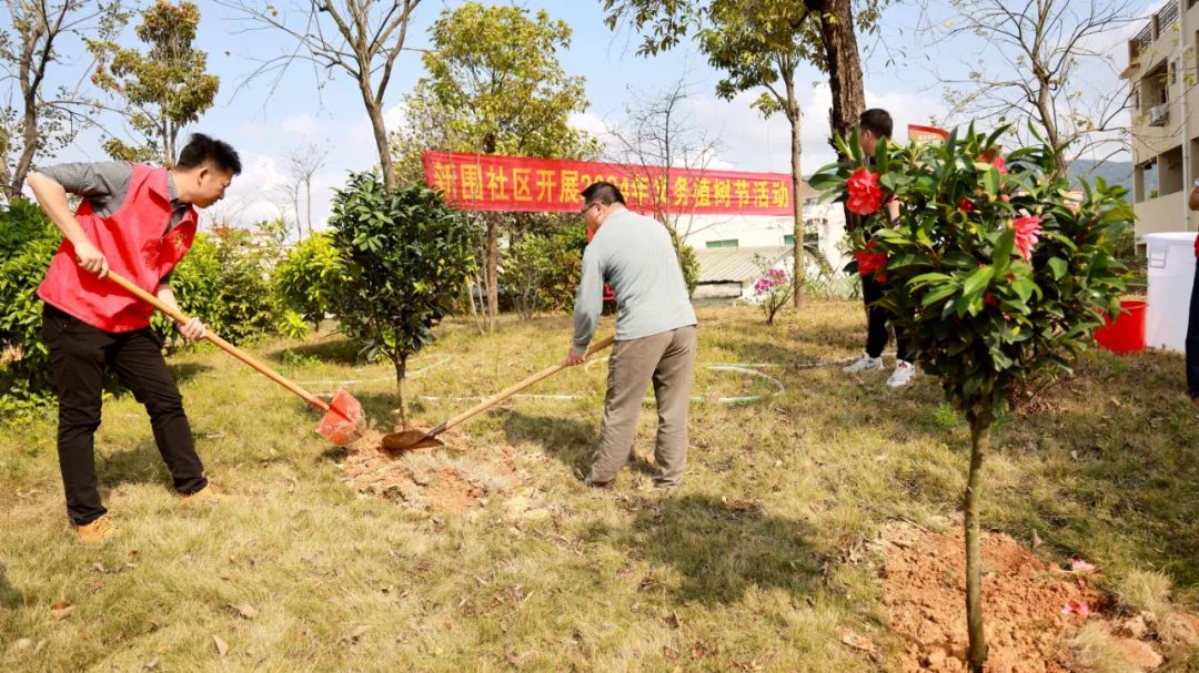 随后,一行到新围仔公园,参与“绿美新围”植树活动。大家拿起铁锹、锄头等工具,分工合作,挥锹挖土、放苗扶正、填土压实、踩实浇水,一棵棵树苗昂扬挺立,为社区的青山绿水增添了一分艳丽。