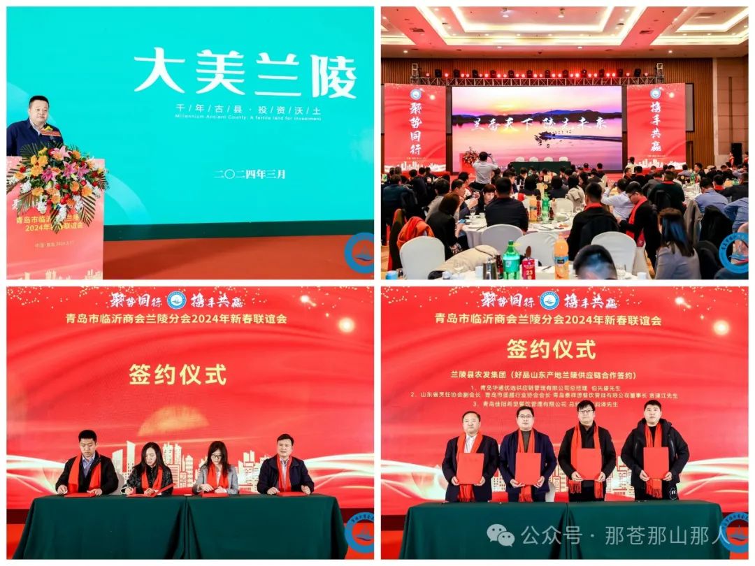 在大会上,苏妮娜部长作了重要讲话,对兰陵商会作为链接兰陵县与青岛市两地发挥的桥梁纽带作用,为青兰两地经济发展做出的贡献给予肯定,也为兰陵在外形象争光添彩、赢得赞誉给予赞扬,对广大会员和老乡积极参与商会活动表示感谢,对商会今后的发展提出了希望要求,让参会人员倍受鼓舞。同时,兰陵县投资促进服务中心作招商推介并播放《风起兰陵》宣传片;兰陵县商务局、县农发集团分别与青岛市临沂商会兰陵分会牵头招引的外商外资项目代表、“好品山东、产地兰陵”供应链战略合作项目代表进行签约。