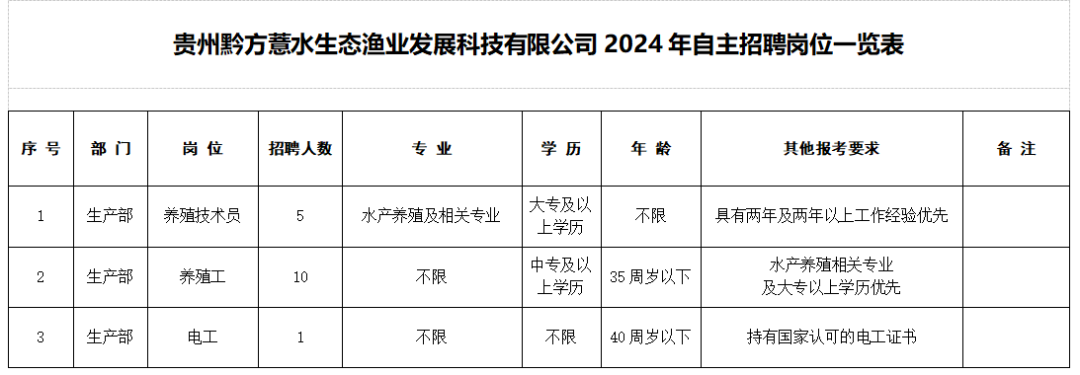 贵州黔方薏水生态渔业发展科技有限公司招聘!部分岗位学历不限!