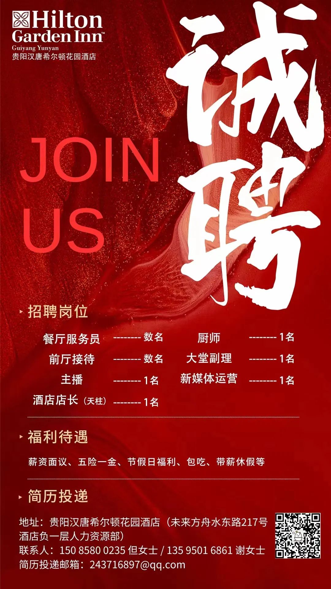 招聘新媒体运营/服务员/厨师等7岗!五险一金+包吃!贵阳汉唐希尔顿花园酒店(招满为止)