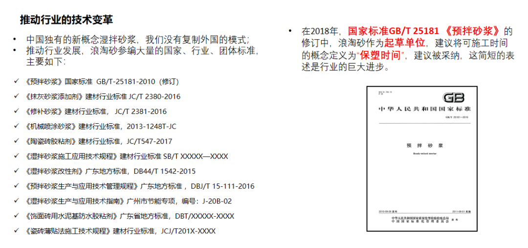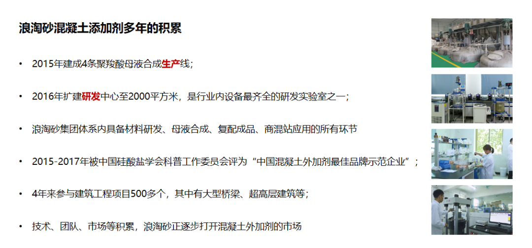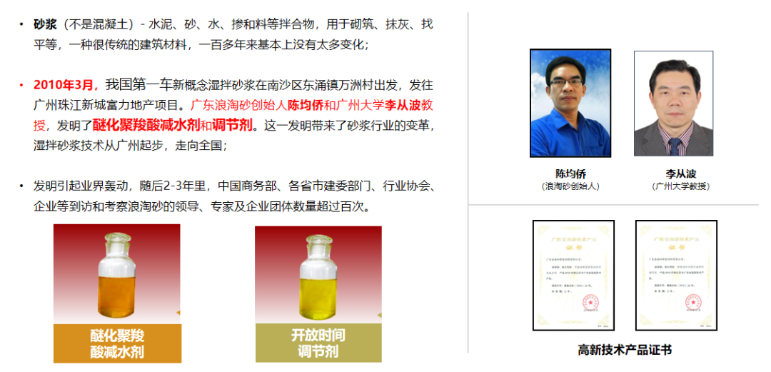 浪淘砂已是湿拌砂浆外加剂第一品牌;浪淘砂行业排名第一,市场占比55%,是龙头企业。过去几年时间,浪淘砂湿拌砂浆业务年平均增长40%以上;浪淘砂依据该产品建立起行业内非常广阔的渠道资源,是浪淘砂迈向发展的基础……