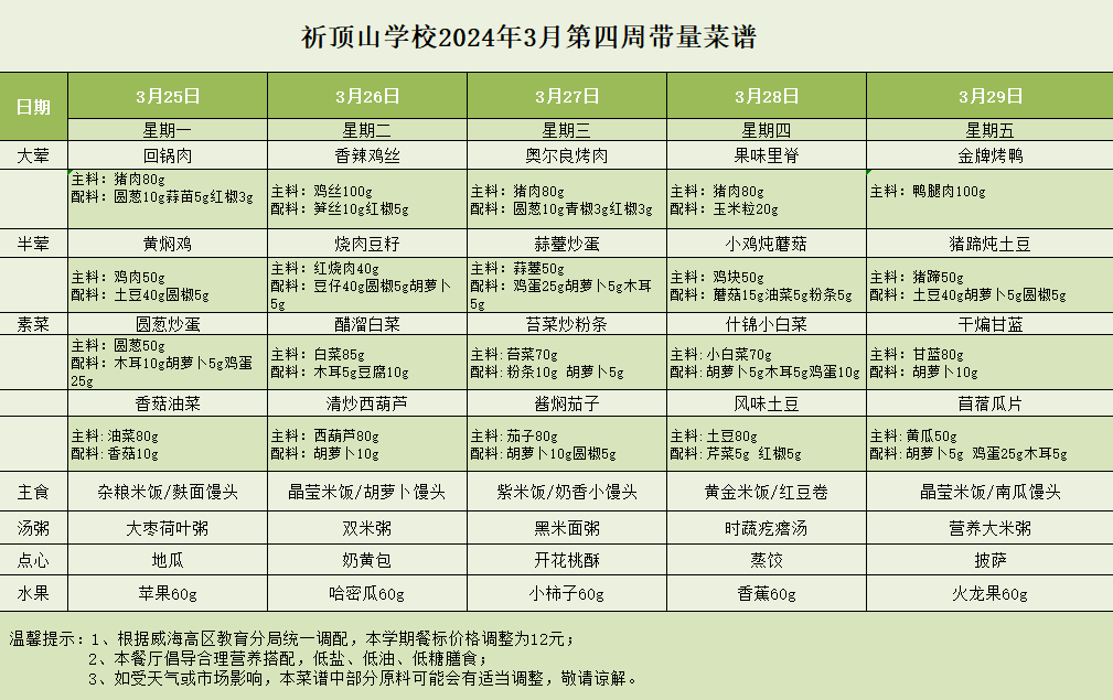 我们将定期公示每周菜谱,每周邀请两位家长不定期到校进行陪餐、参观学生就餐情况,如您有到校陪餐意愿请与班主任老师联系,我们诚挚欢迎您的到来。