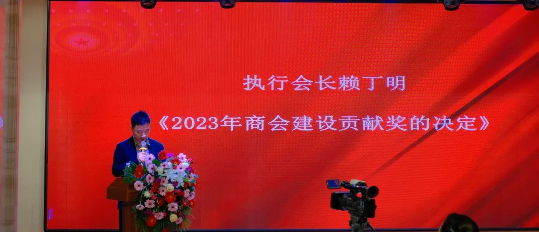 执行会长赖丁明宣读《2023年商会建设贡献奖的决定》(为受表彰的单位和个人颁发证书和奖品)