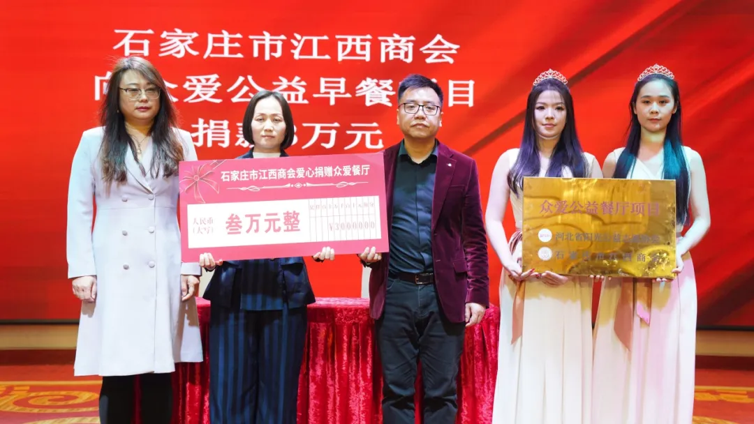 石家庄市江西商会和河北阳光公益志愿协会在大会上发起为环卫工人、孤寡老人、无家可归者提供免费早餐的“众爱公益早餐”项目募捐,得到10家商协会(石家庄市邢台商会、河北移动营销企业商会、河北省礼品业商会、河北省民营企业合作发展促进会、河北省客家商会、河北省广东商会、石家庄市承德商会、石家庄市衡阳商会、河北省农业风险防控联合会、石家庄市沛县商会)响应支持,石家庄市江西商会现场募捐人民币3万元。