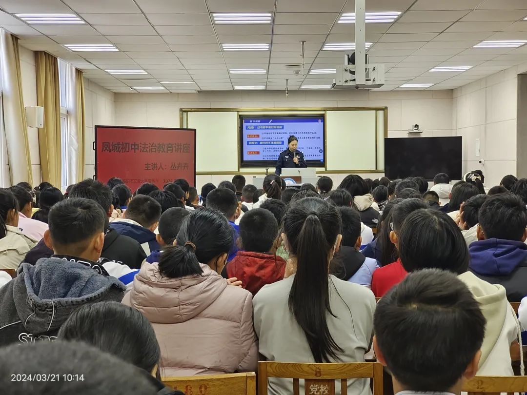 3月21日,凤城初中邀请交警大队警官到校开展法治教育讲座,以案说法,详细介绍了安全过马路、乘坐公共交通工具和私家车等日常出行安全注意事项,提高了学生的交通安全意识和自我保护能力。(信息员:鞠爱宠 )
