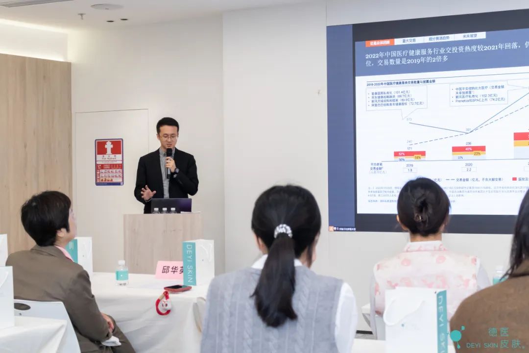 随后,邹忠进行主题为《皮肤医学美容行业及机构介绍》的分享。他向大家介绍了医美行业的市场结构,将医美分为两个大类:手术整形和非手术的轻医美。随着市场的发展,国内的医美行业已经从最初的手术整形为主转向以非手术的轻医美为核心的市场结构。同时,他向大家讲解了德医皮肤的发展轨迹和市场定位,创立六年多来,德医专注于皮肤医疗各细分领域,提供“循证医学”本质的皮肤医学诊疗和医疗级的皮肤美容服务。最后他表示,非常荣幸能够担任上海交大深圳行业研究院第一期行业导师,也向各位校友的支持表示感谢。