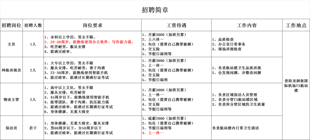 北京欣亚中物业服务有限公司贵阳机场项目部招聘文员、网格巡视员!上一休一+包住宿!