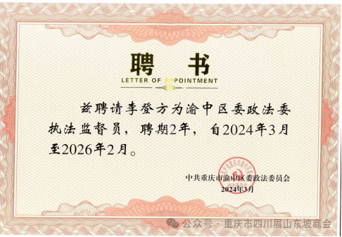 同时,为强化执法力量,监督有序执法,本会副会长兼秘书长李登方作为一名执业律师,被渝中区委政法委聘为渝中区公检法执法监督员。区法院党组书记、院长熊德全为李登方颁发聘书;希望监督员们时刻对公检法机构的执法合法性、合规性进行监督,确保服务下沉,打通满足群众法治需求“最后一公里”。