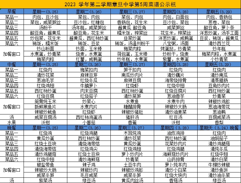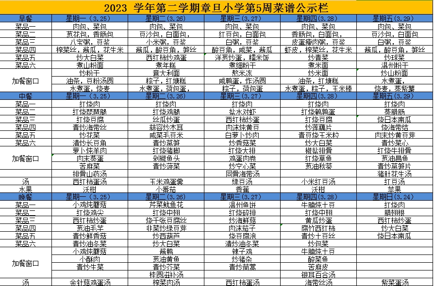 章旦中学教育集团每周都会选择当季的新鲜瓜果蔬菜以及肉类帮孩子们做好营养的搭配,让孩子们能够摄取足够的营养,也能吃得开心,吃得放心。让我们一起来看一下本周孩子们在学校的菜谱吧!