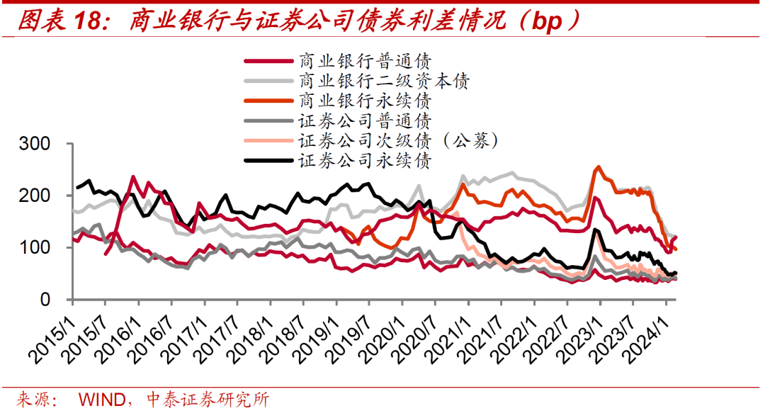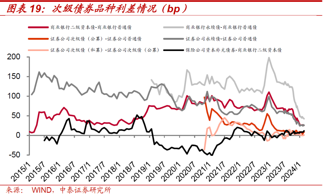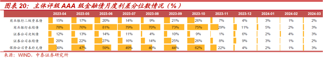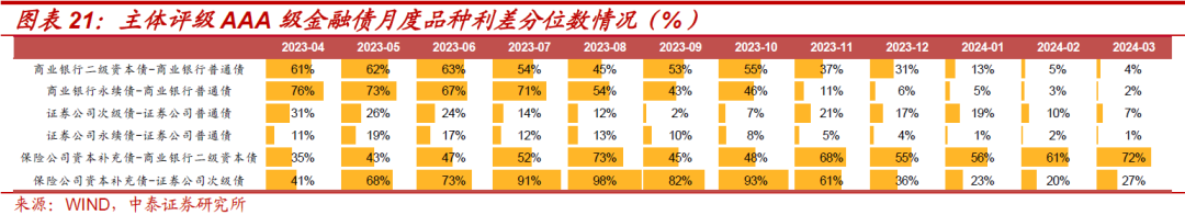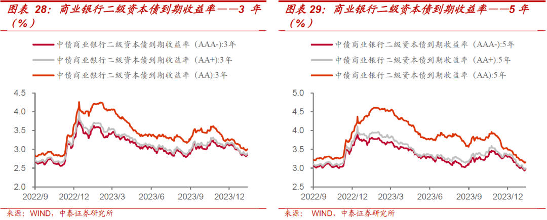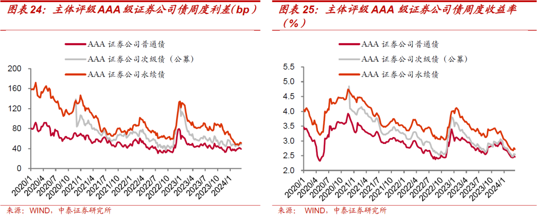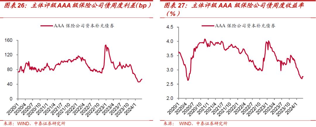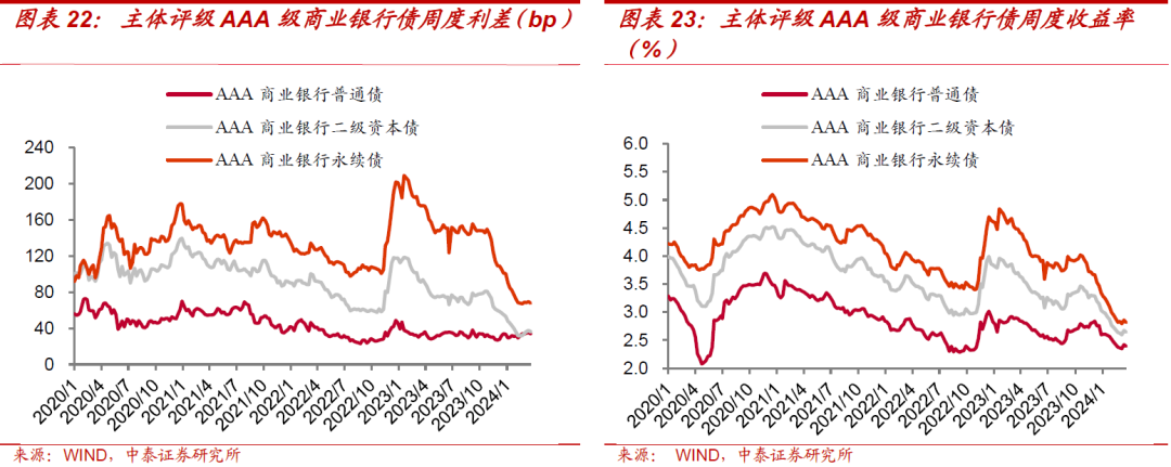 ◼ 金融债:本周商业银行二级资本债和证券公司次级债利差较上周有所收窄,保险公司资本补充债券利差较上周有所走阔。其中,商业银行二级资本债利差收窄1.94bp,证券公司次级债利差收窄0.27bp,保险公司资本补充债券利差走阔2.12bp。分级别看,本周AAA级商业银行二级资本债、证券公司次级债、保险公司资本补充债券利差分别为36.2bp、48.4bp、53.8bp。其中,商业银行二级资本债利差收窄1.3bp,证券公司次级债利差收窄0.2bp,保险公司资本补充债券利差走阔0.2bp;AA级商业银行二级资本债、保险公司资本补充债券利差分别为171.5bp、376.7bp,其中,商业银行二级资本债收窄4.7bp,保险公司资本补充债券利差走阔2.2bp。隐含评级方面,AA+商业银行二级资本债利差收窄1.8bp,证券公司次级债利差收窄0.2bp,保险公司资本补充债券利差收窄3.1bp,商业银行永续债利差收窄2.3bp,证券公司永续债利差收窄2.3bp。品种利差上,AAA级商业银行二级资本债-商业银行普通债利差收窄0.1bp,证券公司次级债-证券公司普通债利差走阔1.3bp,保险公司资本补充债券-商业银行二级资本债利差走阔2.4bp,保险公司资本补充债券-证券公司次级债利差走阔1.5bp。收益率方面,商业银行二级资本债收益率与上周基本持平,证券公司次级债收益率与上周基本持平,保险公司资本补充债券收益率与上周基本持平。