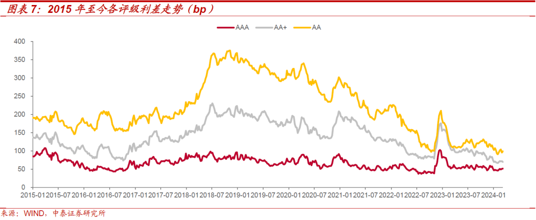 ◼ 产业债:总体利差走阔,其中AAA和AA评级信用利差分别走阔0.7bp和3.5bp,分处20%和0%历史分位,AA+评级信用利差收窄2.1bp,处于0%历史分位。多数行业本周利差有所走阔。申万一级行业中,AAA级行业信用利差走阔幅度最大为纺织服装,走阔6.6bp,收窄幅度最大为轻工制造,收窄20.3bp;AA+级行业信用利差走阔幅度最大为农林牧渔,走阔3.9bp,收窄幅度最大为通信,收窄19.5bp;AA级行业信用利差走阔幅度最大为建筑装饰,走阔4.3bp,收窄幅度最大为农林牧渔,收窄22.5bp。申万二级行业中,AAA级行业信用利差走阔幅度最大为服装家纺,走阔6.6bp,收窄幅度最大为造纸,收窄20.3bp;AA+级行业信用利差走阔幅度最大为化学纤维,走阔9.1bp,收窄幅度最大为通信设备,收窄19.5bp;AA级行业信用利差走阔幅度最大为渔业,走阔9.0bp,收窄幅度最大为煤炭开采,收窄10.5bp。中央国企、地方国企和民营企业中,AAA级行业信用利差均走阔,其中走阔幅度最大为民营企业,走阔2.3bp,走阔幅度最小的为地方国有企业,走阔0.3bp;AA+级行业信用利差均收窄,其中收窄幅度最大为民营企业,收窄2.8bp,收窄幅度最小的为地方国有企业,收窄1.7bp;AA级行业信用利差走阔幅度最大为中央国有企业,走阔2.4bp,收窄幅度最大为民营企业,收窄10.1bp。截至2024年3月15日,存量债只数较多的产业主体中,北汽集团、河钢集团和北部湾港集团利差分别为56.9bp、59.1bp和60.6bp,相较上周北汽集团和河钢集团分别走阔1.4bp和1.7bp,北部湾港集团收窄2.5bp。