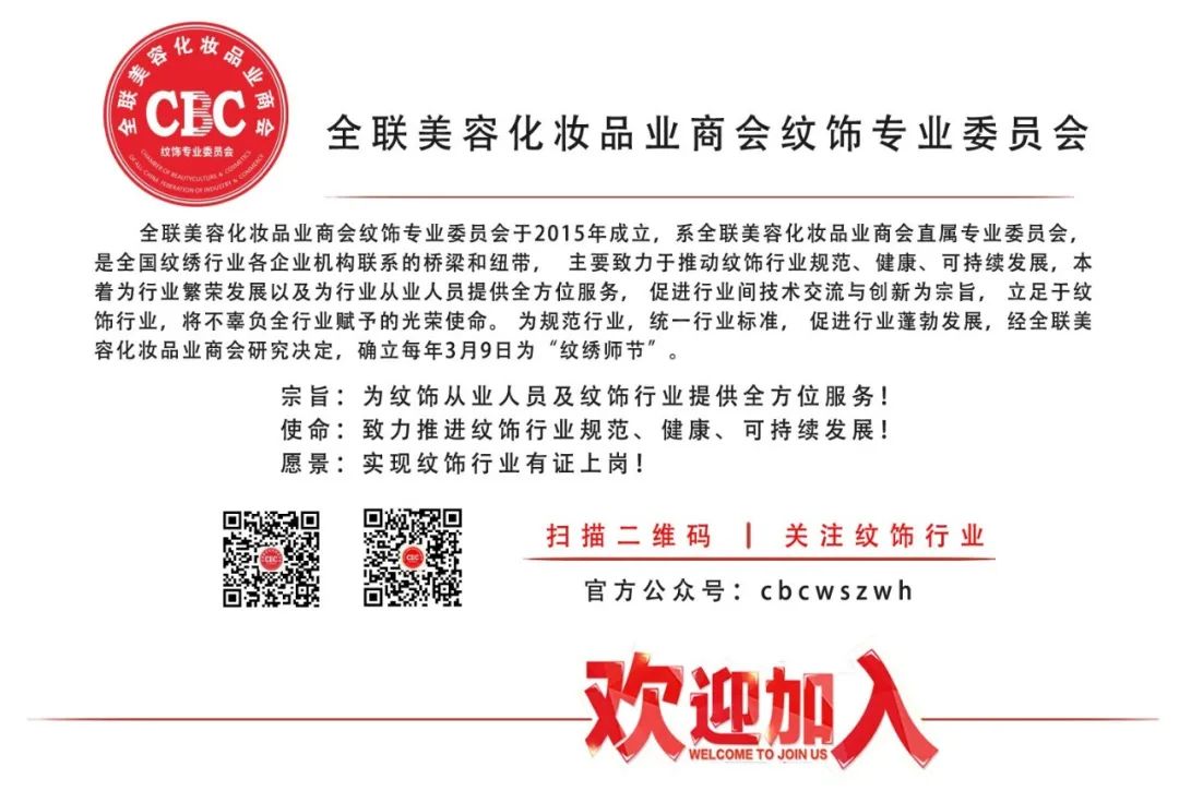 欢迎全国的纹绣家人加入进来,共同推动纹绣行业职业技能培训的工作,让我们共同促进行业规范,加强行业自律,提高从业人员技能水平,为美丽人生、美化生活做出我们的贡献。希望通过行业同仁们的共同努力,让纹饰行业真正插上腾飞的翅膀!