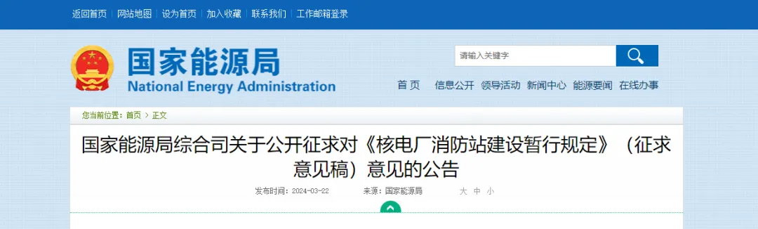国家能源局综合司关于公开征求对《核电厂消防站建设暂行规定》(征求意见稿)意见的公告
