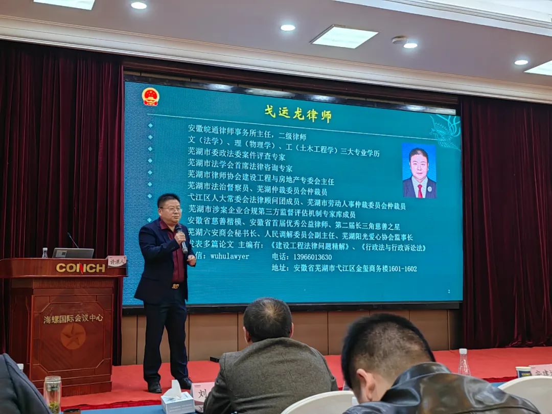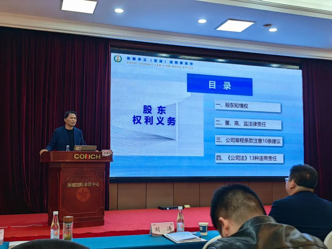 2024年3月24日上午,芜湖六安商会新《公司法》培训活动在城南海螺国际会议中心成功举办。芜湖六安商会名誉会长汪之初,监事长薛敬成,党支部书记花家权,轮值会长方正照、廖圣利,副会长楚祥胜、张华东、涂毅啸以及会长单位芜湖医药健康职业学院、副会长单位及会员企业的相关负责人等80多位学员参加了本次培训。安徽师范大学马克思主义学院副教授、芜湖市社会组织促进会会长安建增应邀参加了本次培训。