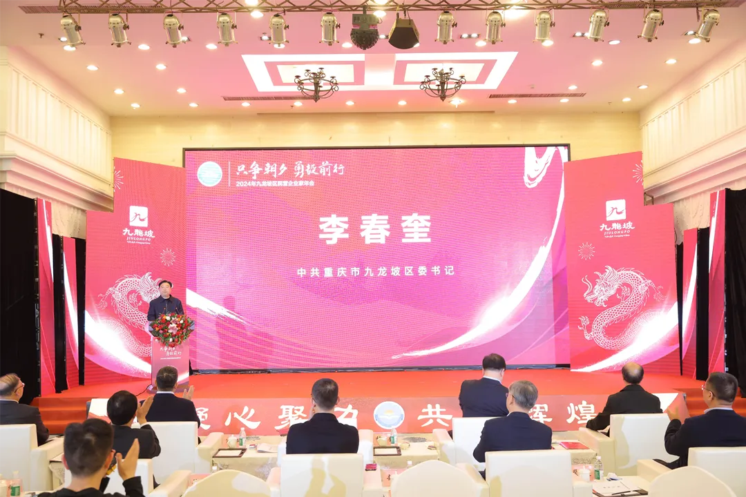 “点赞2023年的亮成绩,给大家喝彩!”李春奎指出,2023年是现代化新重庆建设的开局之年,也是大抓落实、聚力攻坚、唯实争先的一年,广大龙商始终与区委、区政府站在一起、想在一起、干在一起,民营经济整体贡献更大,民营企业自身实力更强,民营企业家回馈社会更多,交出了地区生产总值达1867.07亿元、增长6.5%的高分报表。李春奎要求,各级各部门要毫不动摇鼓励、支持、引导非公有制经济发展,一如既往地把民营企业家当自己人,加强政治引领,做实政策保障,优化企业服务,全力以赴为企业的发展保驾护航。同时,希望广大民营企业与九龙坡一道,共抓奋进新征程的好机遇,携手走强现代产业发展之路、走深扩大对外开放之路、走实保障改善民生之路,共同在建功新重庆、奋进九龙坡中干出新业绩、实现新突破。