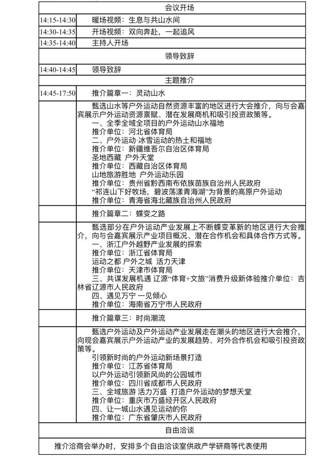 本次推介洽商会围绕户外运动产业区域发展情况,结合上会推介省份和城市户外运动产业发展特点,设置了“灵动山水”、“蝶变之路”、“时尚潮流”三个篇章,河北、新疆、西藏三个省级体育部门和贵州省黔西南州、青海省海北州等五个单位,将重点推出奇山秀水、地貌多样、百川相织、色彩斑斓的户外运动人间圣地的资源盛景和吸引投资的主要政策;浙江、天津两省体育部门和吉林省辽源市、海南省万宁市等四家单位,将围绕设施利用、特色发展、跨界融合等,从发展活力释放、体育消费升级、户外热潮激发等方面推介各地的新方案和吸引全国户外企业参与打造的新举措;江苏省体育局、四川省成都市、重庆市万盛经开区和广东省肇庆市,将围绕户外运动新场景打造、时尚都市建设、潮流户外项目等进行推介,动员政产学研参与协同创新,用户外运动产业发展助力时尚潮流生活方式形成。