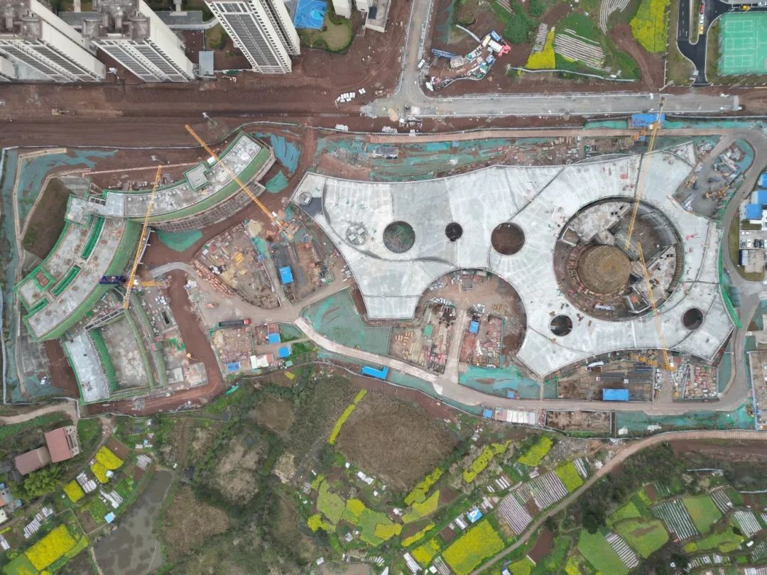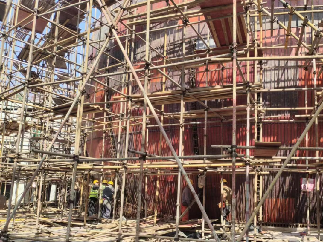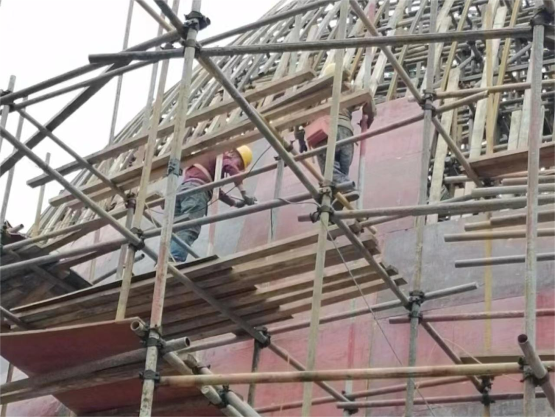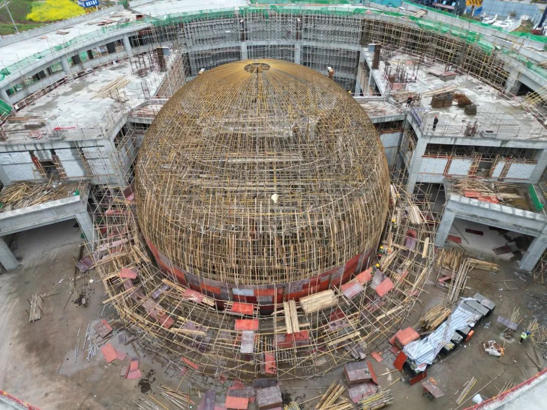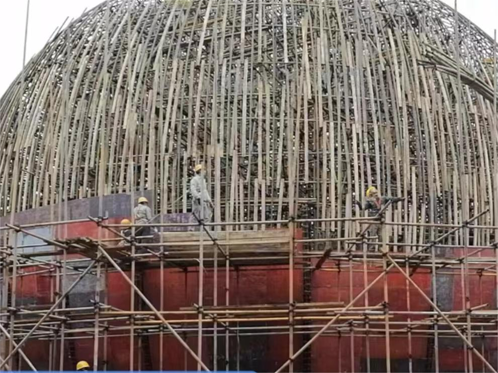 ▼3月18日-3月24日,球幕木工搭支撑外架底模、安装绑扎钢筋