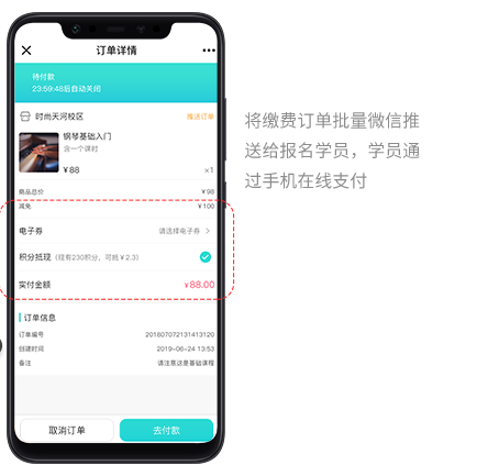 家长仅需扫描学校公众号二维码,即可在线浏览全部课程。将心仪的课程添加到购物车,一键结算,支持微信、支付宝、银行卡等多种支付方式,简单几步,即可完成购课。这种便捷的在线报名方式,不仅节省了家长到校排队的时间,也减轻了招生老师现场整理报名事宜的负担。让报名流程更加高效、顺畅,为家长和学校都带来了极大的便利。