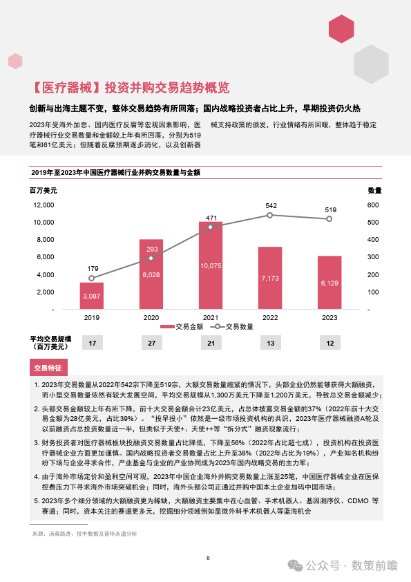 1.2023年交易数量从2022年542宗下降至519宗,大额交易数量缩紧的情况下,头部企业仍然能够获得大额融资,而小型交易数量依然有较大发展空间,平均交易规模从1,300万美元下降至1,200万美元,导致总交易金额减少;