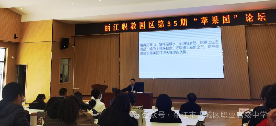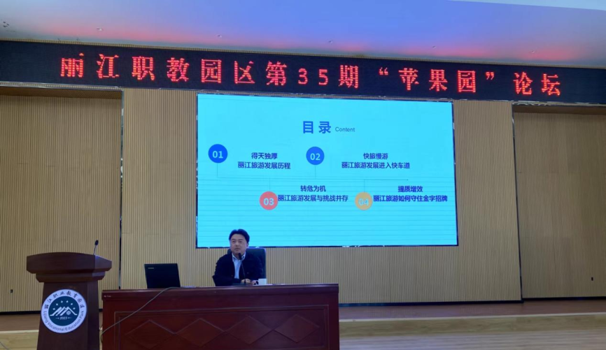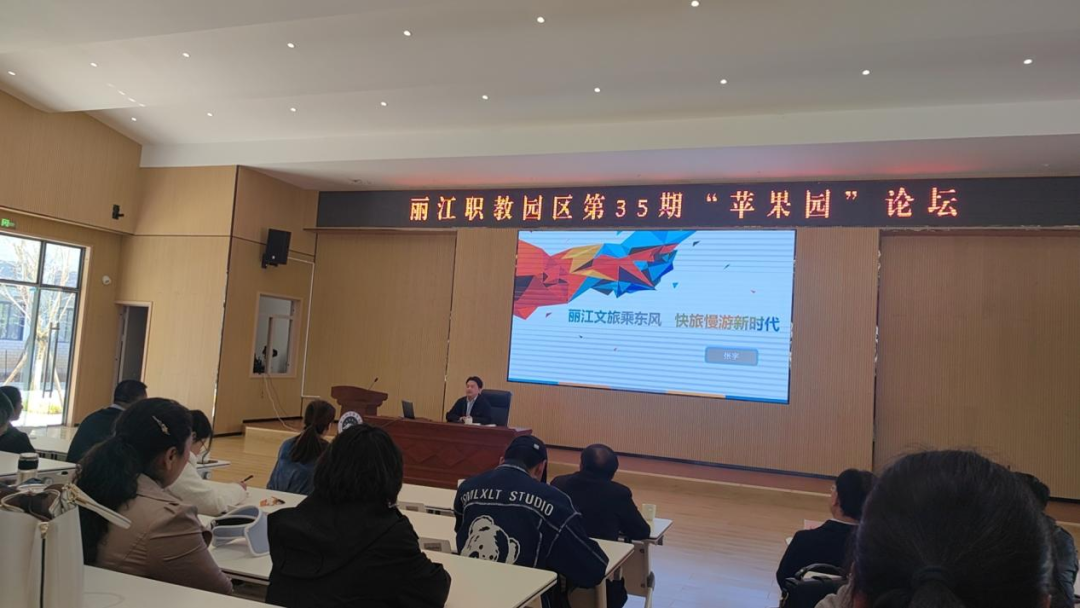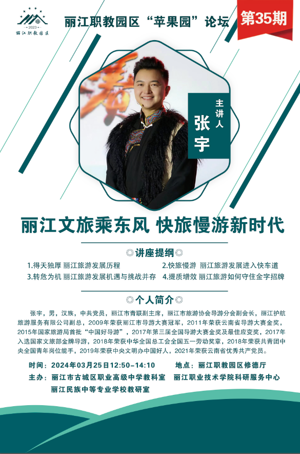 3月25日,丽江职教园区第35期“苹果园”论坛在园区修德厅举行。本次讲座由古城区职高教科室主办,邀请了丽江旅游行业内的杰出人物——张宇老师,为园区四校的教师们带来了一场关于丽江旅游实现高质量发展的精彩分享。