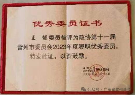 我会执行会长王能、联席会长符忠文被评为雷州市政协第十一届雷州市委员会 “2023年履职优秀委员”。