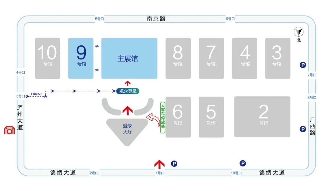 1、小客车从锦绣大道会展中心1号道口和10号道口地下停车处进入展馆