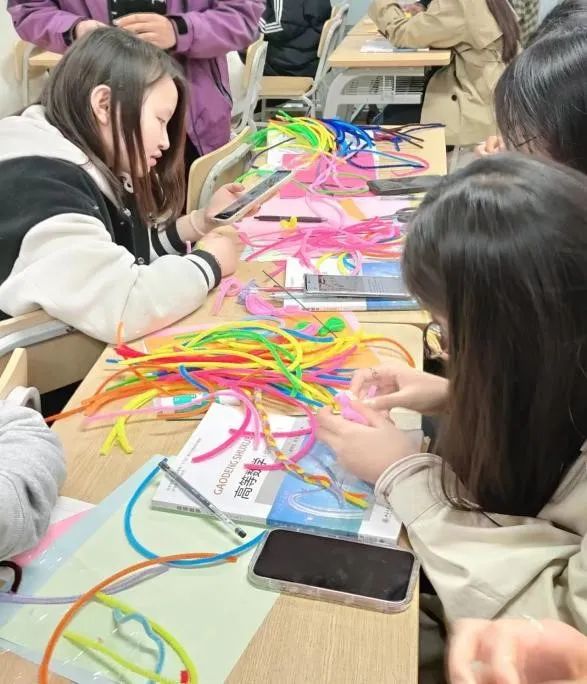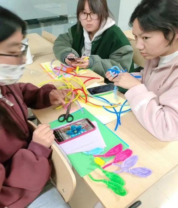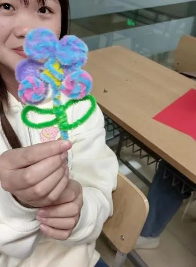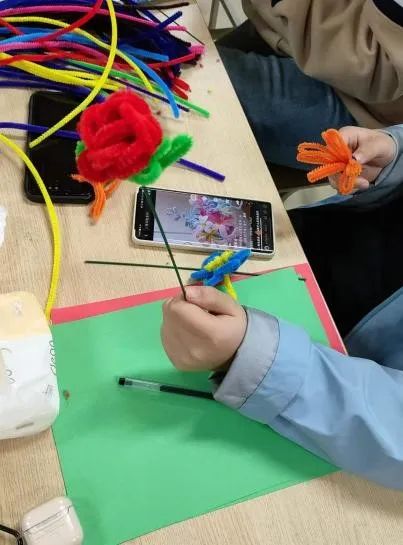 活动开始前,由班委冯毅、马沛烽、马晨贺同学为大家发放手工材料,大家前前后后围在一起,兴高采烈地开始制作自己的艺术品。交换材料、互相帮助,时间在大家用心的过程中慢下来,看着原材料在自己手中一点一点变成自己想要的美丽花朵,这时的喜悦感与成就感是无法比拟的。最后大家纷纷拍照展示自己成果的时候,这次活动的意义也得到了升华,专注感受到了当下的美好,幸福的瞬间也被这朵手工的花定格。