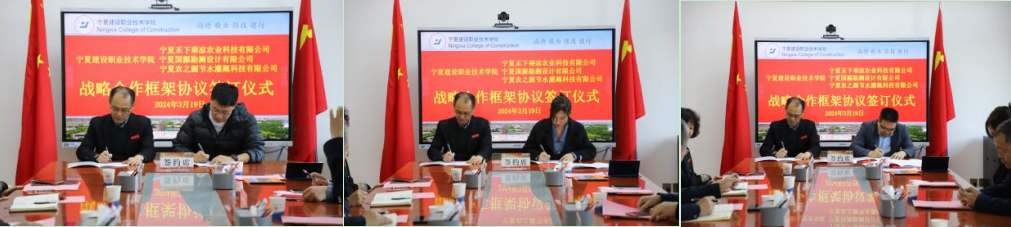 为进一步强化产教融合,提高人才培养质量,我校与宁夏禾下乘凉农业科技有限公司、宁夏国源勘测设计有限公司、宁夏农之源节水灌溉科技有限公司成功签订校企合作框架协议。此次签约彰显了我校在产教融合领域又迈出了坚实一步,更为校企双方在教育创新、技术研发以及产业人才培养等诸多领域深化合作打下了稳固而坚实的基础。学校校长宛国成、副校长崔阳、宁夏禾下乘凉农业科技有限公司董事长许咏、宁夏国源勘测设计有限公司副总经理于丽霞、宁夏农之源节水灌溉科技有限公司总经理张吉宝出席签订仪式,学校教务处处长王博、市政与水利学院党总支书记黄海燕、副书记常肖、教师学生代表参加仪式。