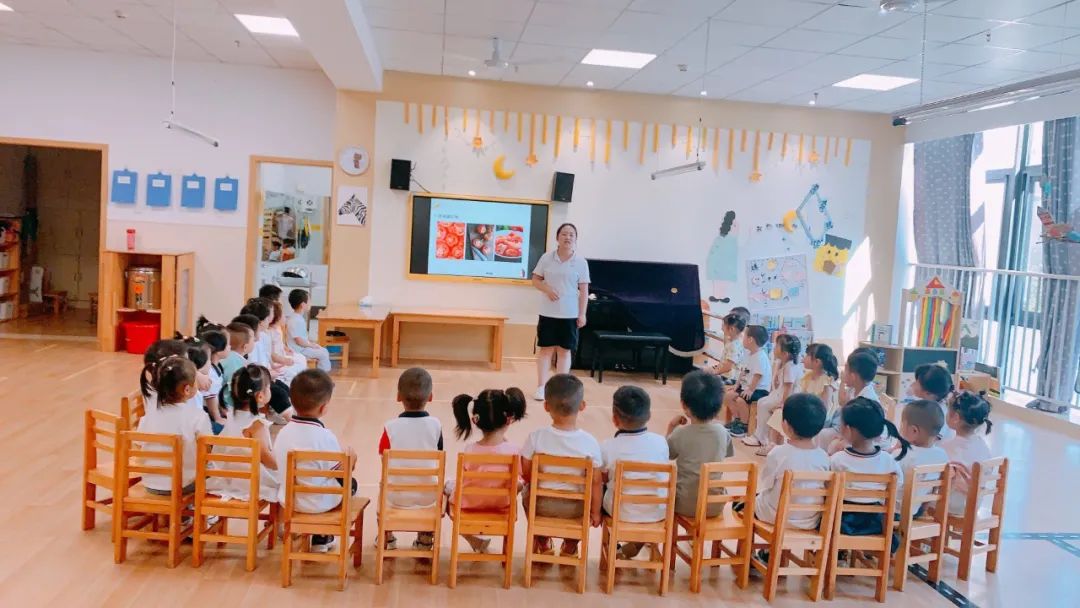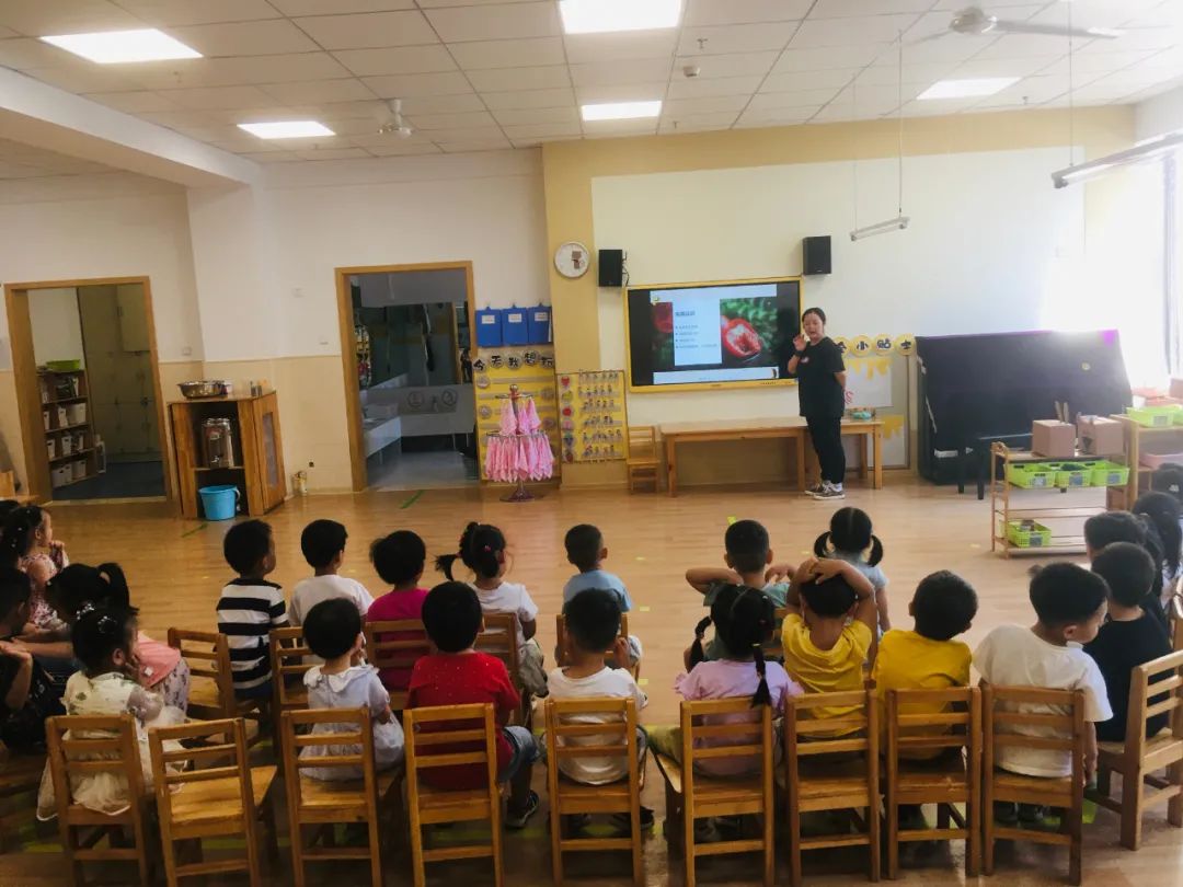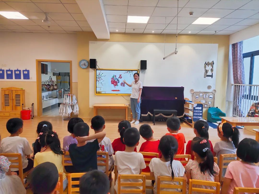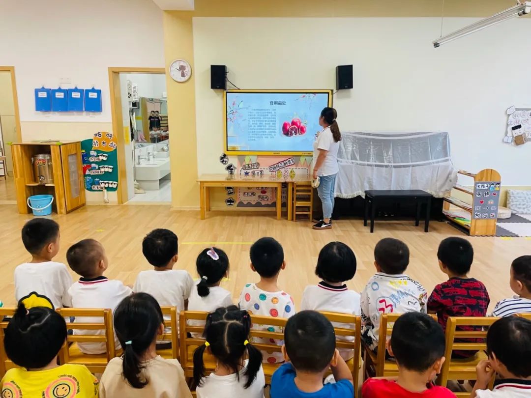 为了让孩子们充分了解石榴,老师们通过生动的ppt教学课件,让孩子们了解石榴。石榴果粒酸甜可口多汁,营养价值高,富含丰富的水果糖类、优质蛋白质、易吸收脂肪等,可补充人体能量和热量,但不增加身体负担。果实中含有维生素C及B族维生素,有机酸、糖类、蛋白质、脂肪及钙、磷、钾等矿物质,能够补充人体所缺失的微量元素和营养成分。还富含丰富的各种酸类,包括有机酸、叶酸等对人体有保健功效。但石榴不可与西红柿、螃蟹、西瓜、土豆同食。