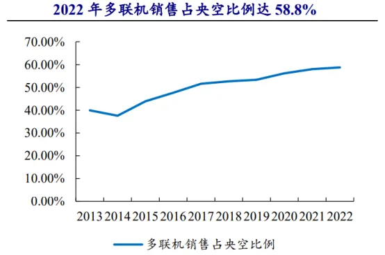 从终端数据来看,2013年到2022年,多联机年复合增速高达13%,远远高于中央空调8%的年复合增速,同时2022年多联机销售占比已经达58.8%。