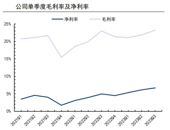 从代表公司盈利能力的毛利率来看,2021年以来就呈现了持续攀升趋势,在2022年以来单季度毛利率更是增速加快,到2023年三季度毛利率提升到了22.1%,带动净利率提升到了6.1%,盈利能力大幅增强。