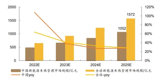 在量价下,我国新能源汽车热管理市场规模增速也非常快,到2025年市场规模有望超过1000亿元,全球市场规模会超过1500亿元。