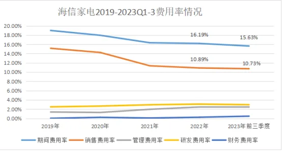 第三个就是得益于费用端的控制,在2022年消费端走弱下,各大消费龙头都在扩张费用稳住营收的情况下,海信家电反而在有效的控制费用。数据显示,2019年以来,公司在营收大幅增长的同时,期间费用率却一直呈现下滑趋势,到2023年三季度销售费用率更是降低到了10.73%,比2019年有明显的下滑,这也大大贡献了毛利率的提升。