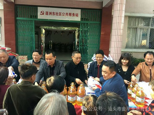 爱心活动一:春节前夕,食品商会联合金平区食药局、工商局等单位到蓬州东社区慰问困难户,为困难群众、低保户送上大米、食用油等过年物资,为他们送温饱。鮀江街道蓬洲东社区是汕头市市委书记陈良贤的挂钩村,近年来在各级政府和社会各界的帮扶下,村容村貌有了大改观,社区居民生活质量提高,社区工作人员努力争取支持,为居民在救助保障等方面提供细致周到的服务,努力把社区建设成为党和政府联系群众的桥梁和精神文明建设的典范。
