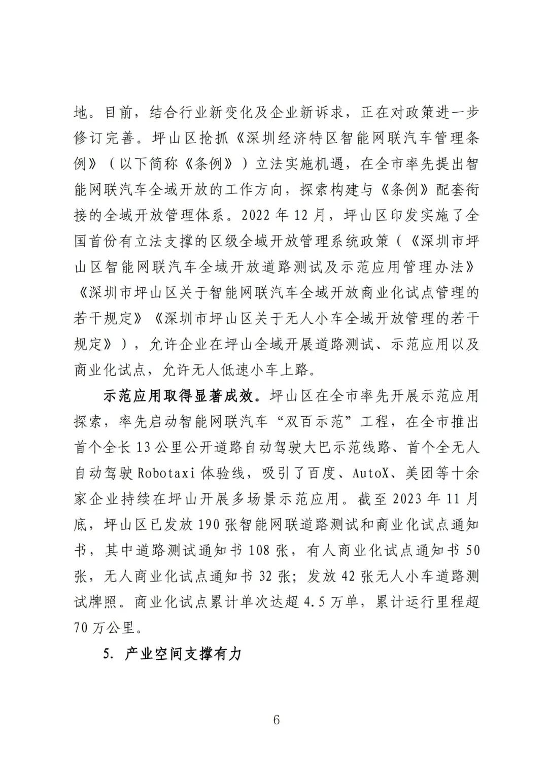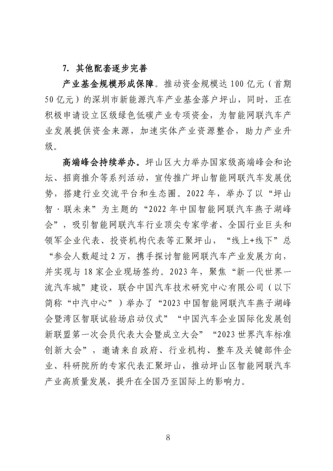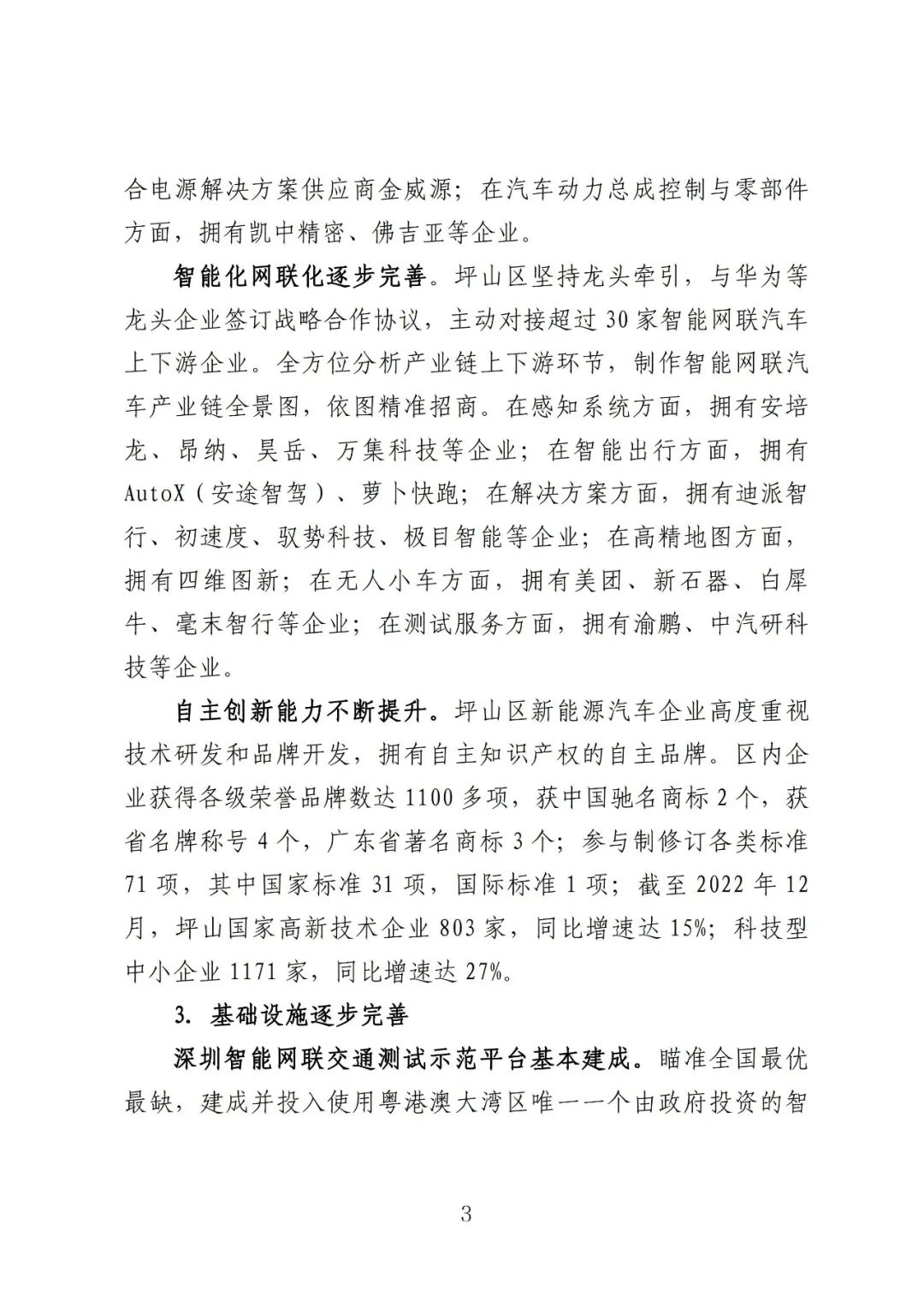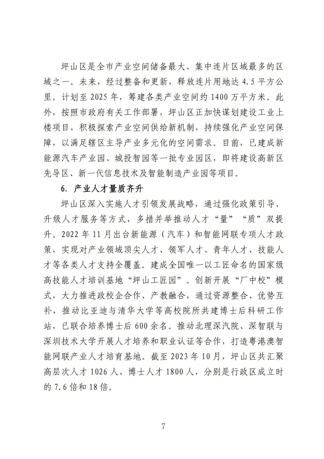 (七)“1+3+N”产业发展空间布局,“1”是指智能网联汽车全域开放;“3”是指分别在高新南、高新北、坪环-江岭片区打造陆空一体智慧车谷、智能车研发智造高地、比亚迪汽车产业示范中心;“N”是指依托创新广场、新能源汽车产业园、湾区智联试验场、深圳技术大学、比亚迪工业园等多节点引入产业链相关企业,形成“全域联动、三区协同、多点共促”的新产业发展格局。