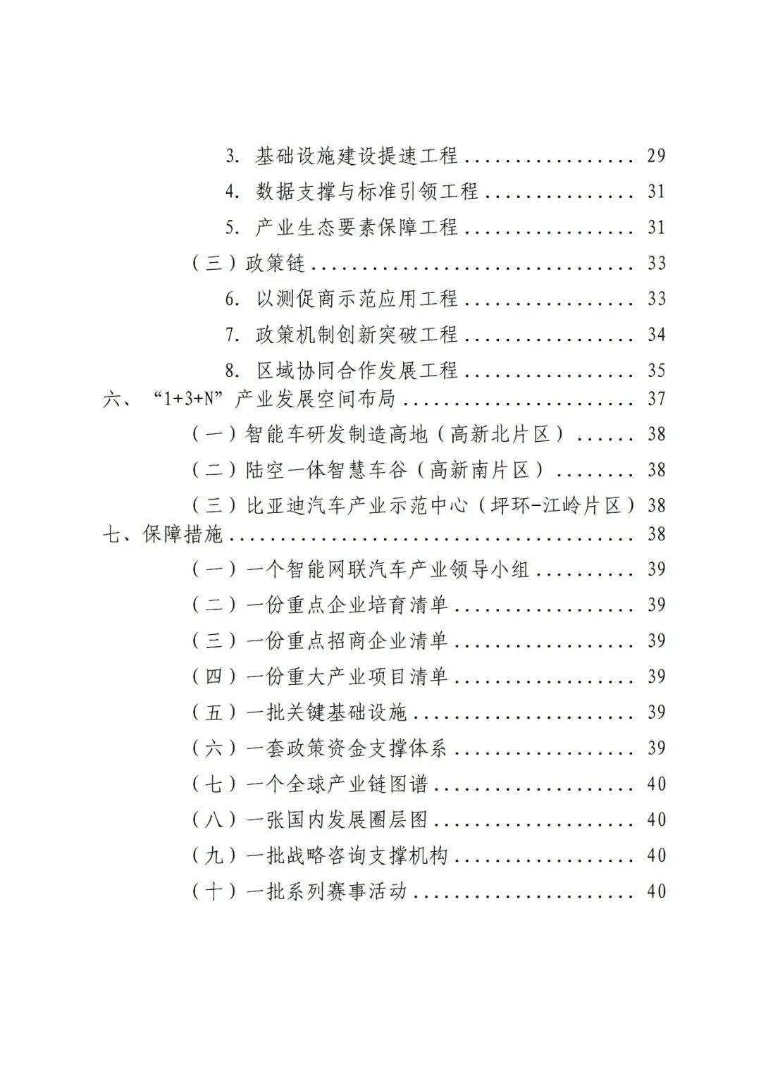 (六)保障措施,构建“十个一”工作体系,包括一个智能网联汽车产业领导小组,一份重点培育企业清单,一份重点招商企业清单,一份重大产业项目清单,一批关键基础设施,一套政策资金支撑体系,一个全球产业链图谱,一张国内发展圈层图,一批战略咨询支撑机构,一批系列赛事活动。