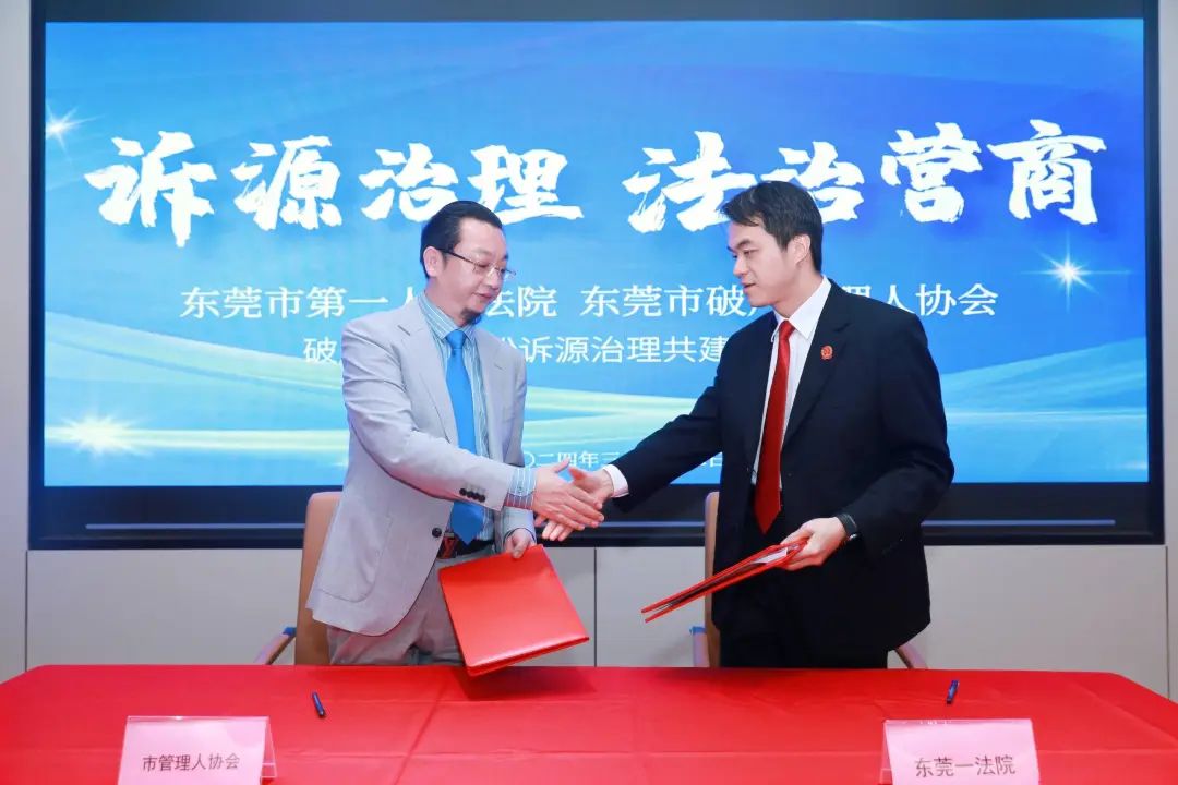 第四项议程,莫然庭长代表东莞市第一人民法院民事审判五庭、刘开坛会长代表东莞市破产管理人协会共同签署了《破产有关纠纷诉源治理共建协议》。