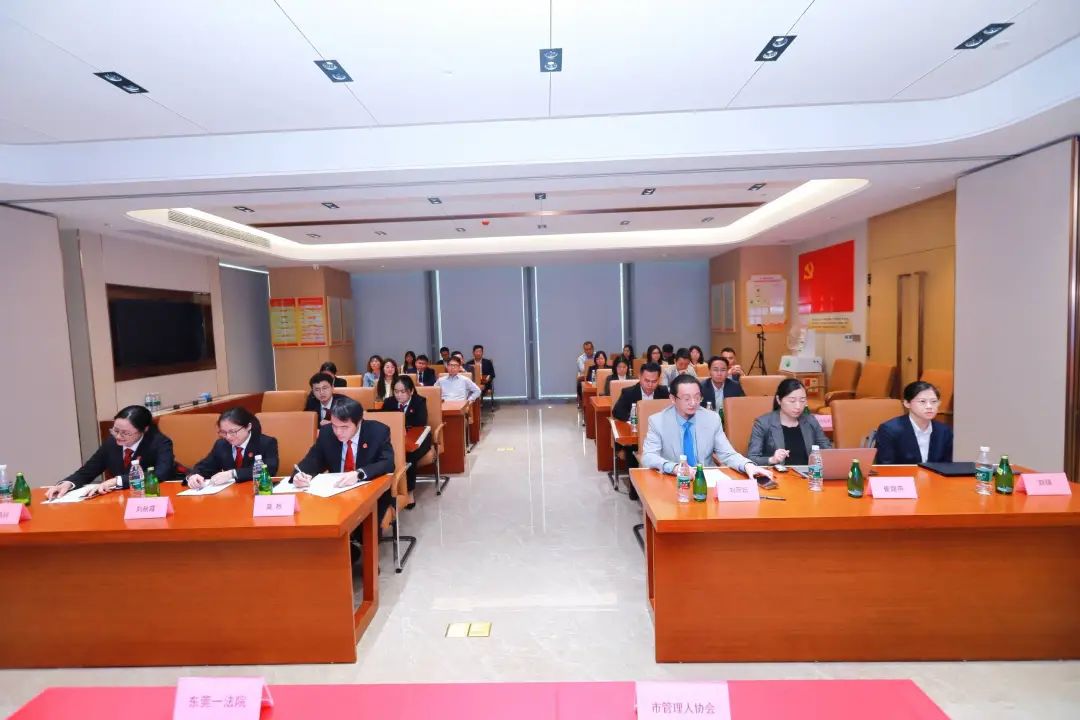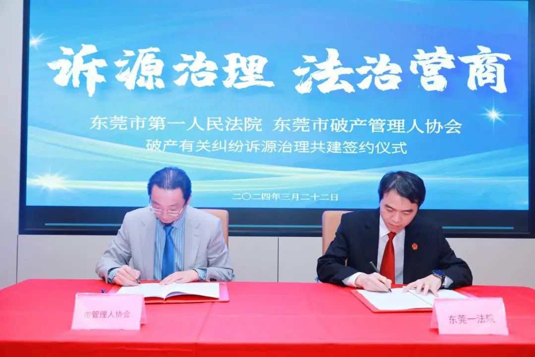 2024年3月22日下午,东莞市第一人民法院民事审判五庭与东莞市破产管理人协会举行了破产有关纠纷诉源治理共建签约仪式,破产有关纠纷诉源治理工作室在东莞市破产管理人协会挂牌成立。东莞市第一人民法院民事审判五庭庭长莫然法官、安燕玲法官、刘秋霞法官以及东莞市破产管理人协会会长刘开坛、协会代表、特邀调解员参加了本次活动。