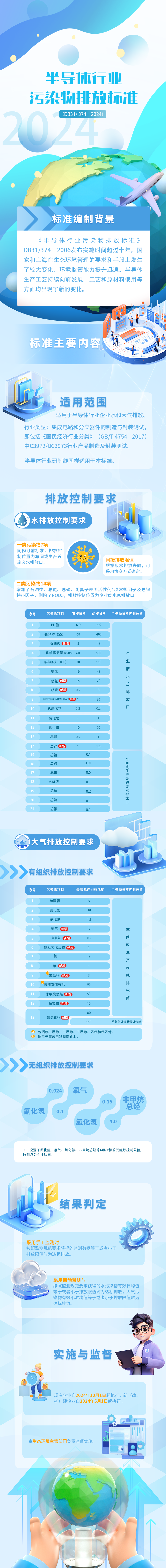 近日,上海市生态环境局、上海市市场监督管理局发布了《半导体行业污染物排放标准》(DB31/374-2024)。《半导体行业污染物排放标准》(DB31/374-2006)发布实施时间超过十年,国家和上海在生态环境管理的要求和手段上发生了较大变化,环境监管能力提升迅速。半导体生产工艺持续向前发展,工艺和原材料使用等方面均出现了新的变化。同时,半导体生产工艺一直在向前发展,其工艺和原材料使用等方面都出现了新的变化。修订后的标准在大气方面设置13个有组织大气污染物控制项目,新增氯气、氰化氢、锡及其化合物、苯、苯系物、非甲烷总烃、颗粒物和氮氧化物等8项。设置了氰化氢、氯气、氯化氢、非甲烷总烃等4项指标的无组织控制限值。