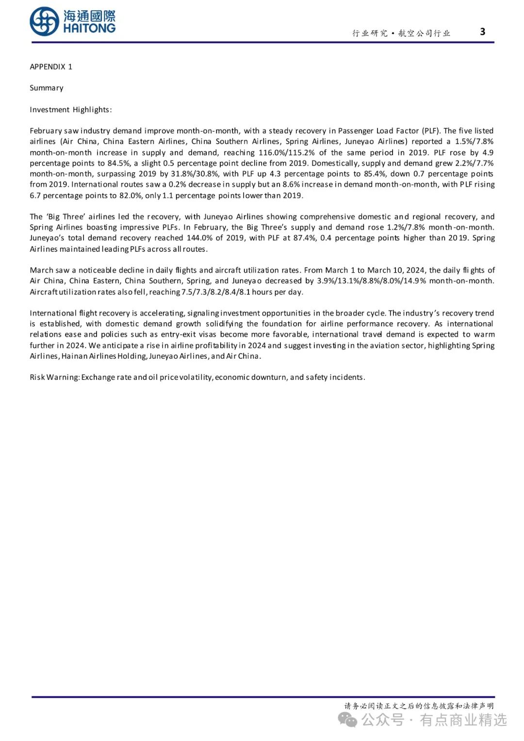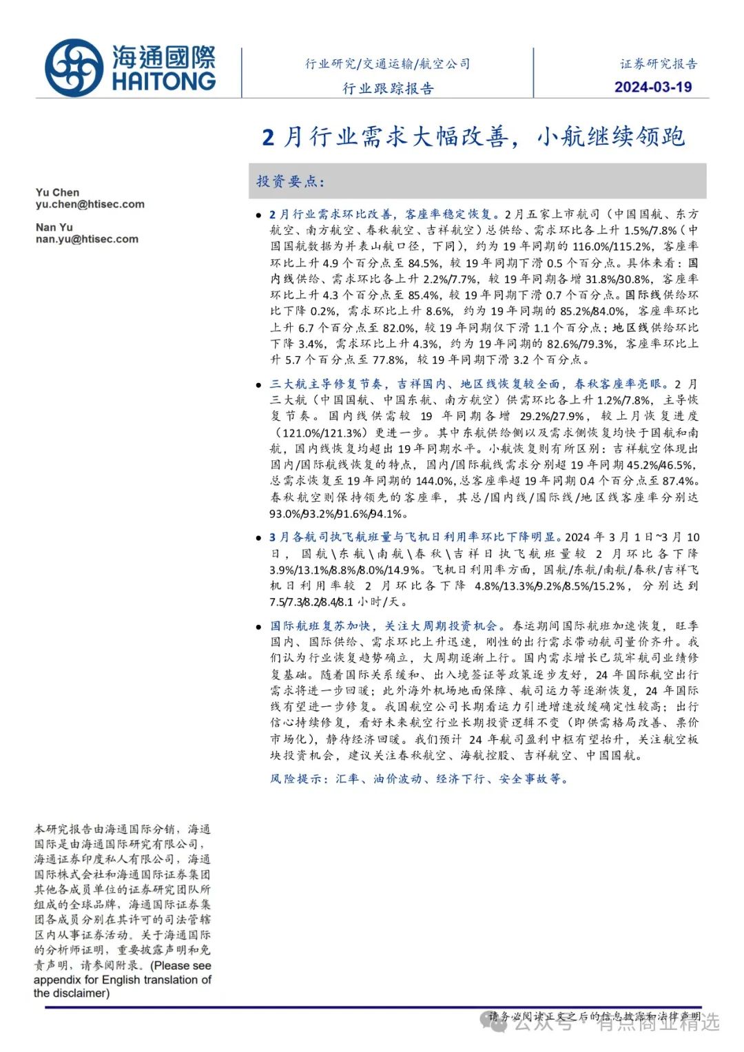 约为 19 年同期的 116.0%/115.2%,客座率环比上升 4.9 个百分点至 84.5%,较 19 年同期下滑 0.5 个百分点。具体来看:国内线供给、需求环比各上升 2.2%/7.7%,较 19 年同期各增 31.8%/30.8%,客座率环比上升 4.3 个百分点至 85.4%,较 19 年同期下滑 0.7 个百分点。