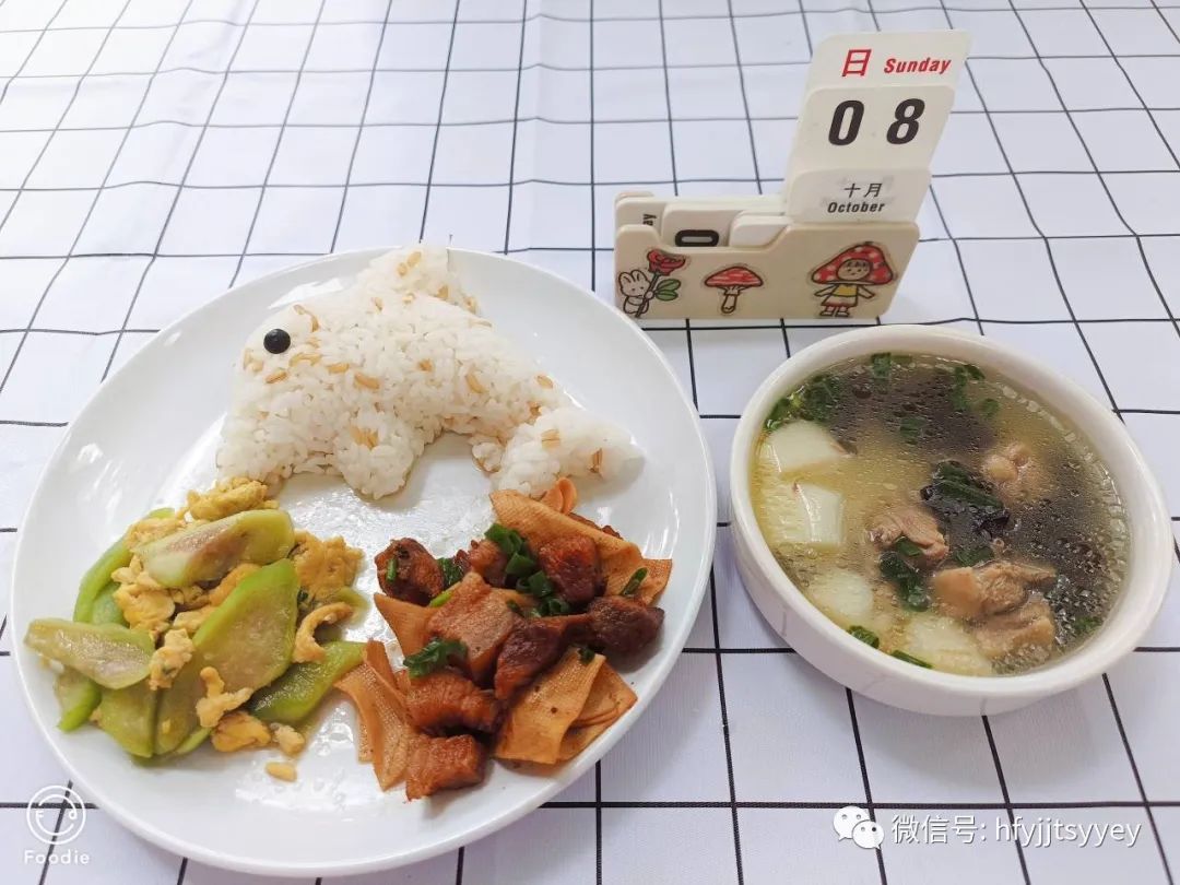 午餐:麦仁米饭 千张烧肉 丝瓜炒鸡蛋 山药木耳鸽子汤