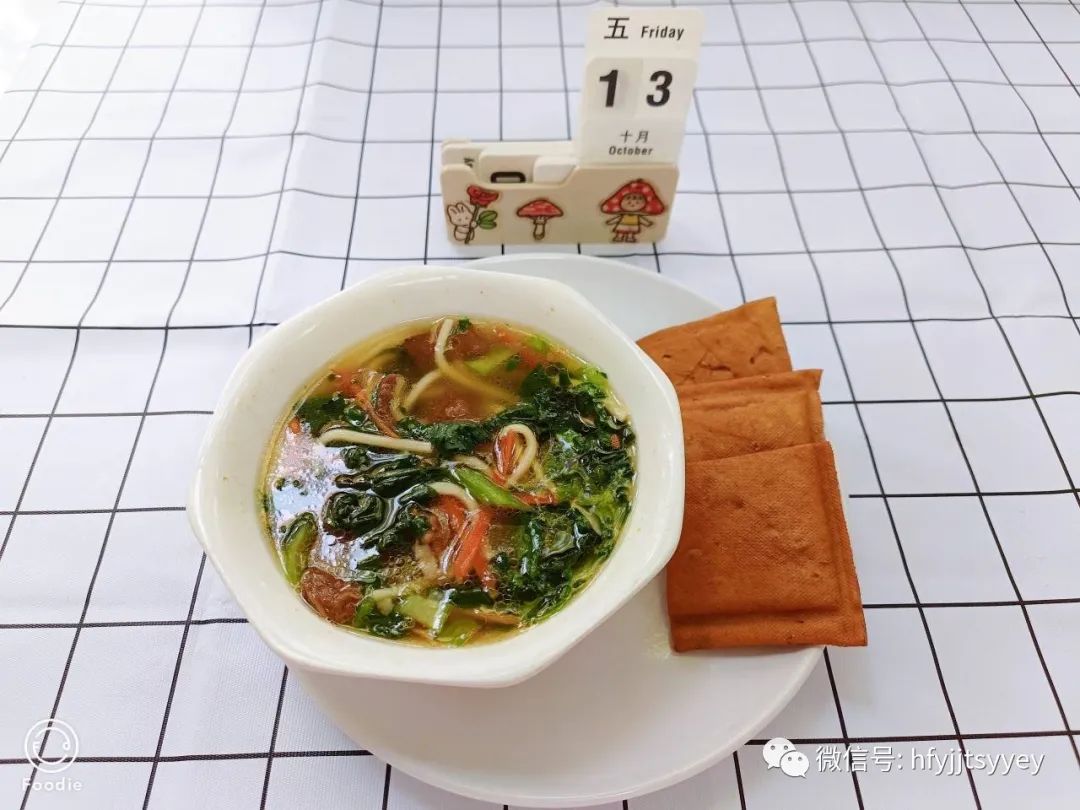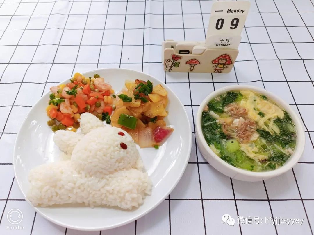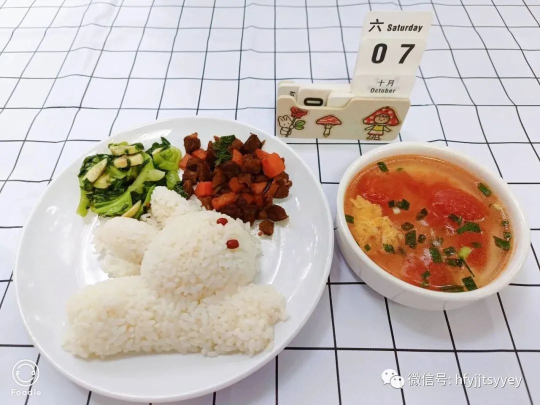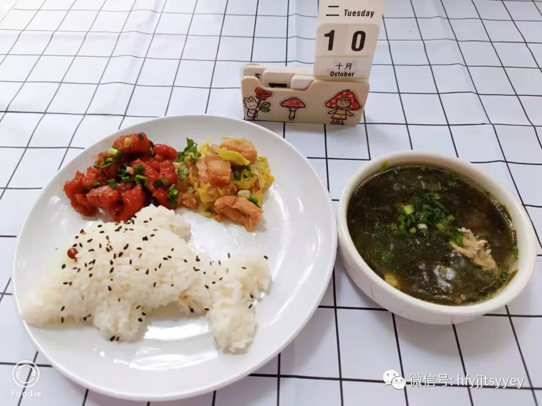 午餐:香米饭 胡萝卜炖牛肉 口菇炒青菜 西红柿鸡蛋汤