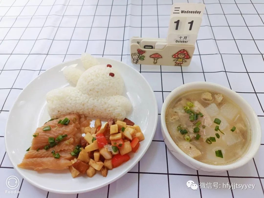 午餐:香米饭 清蒸巴沙鱼 茭白香干肉丁 白萝卜老鸭汤
