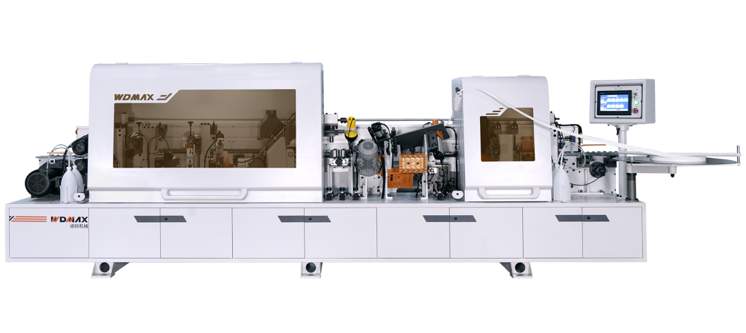 ②斜边涂胶压贴机构,斜直边均匀涂胶,无缝粘合斜面封边。