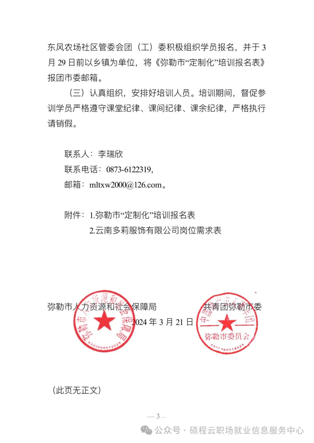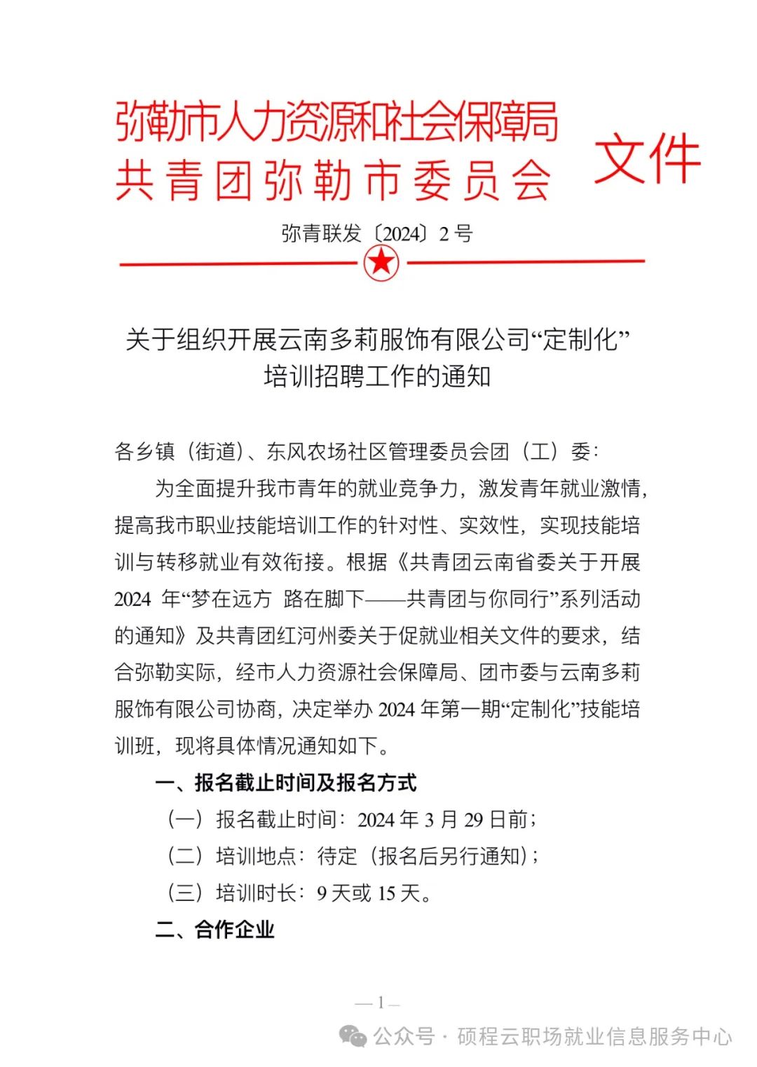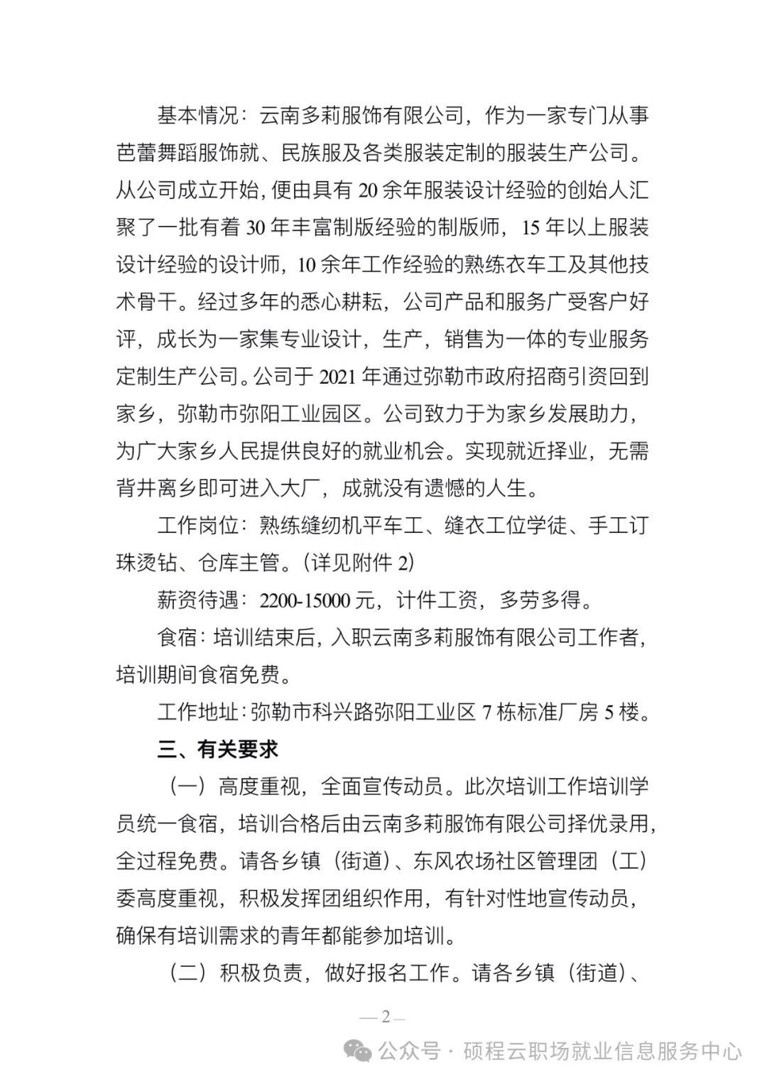 关于组织开展云南多莉服饰有限公司“订制化”培训招聘工作的通知