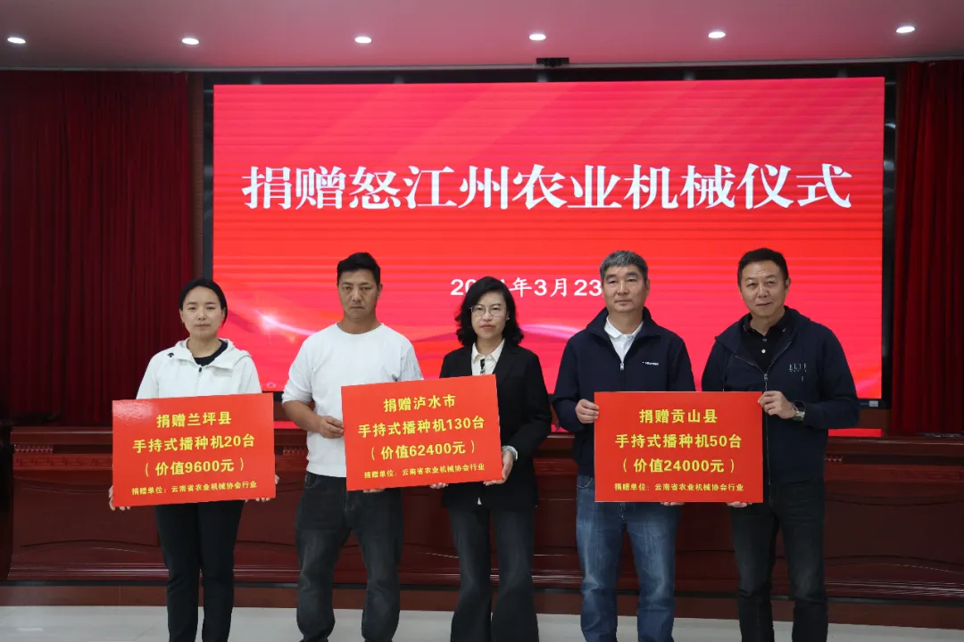 3月23日,在云南省农业农村厅农业机械化管理处的组织下,捐赠怒江州农业机械仪式在怒江州农业农村局举行。云南农机行业协会、云南添力农业机械科技有限公司、福贡丰源水电发展有限公司等为怒江州捐赠价值24万元的500台套点播机,倾情助力春耕春播生产。这是继云南省农业机械行业协会去年爱心捐赠怒江后的又一爱心之举。